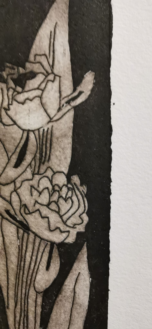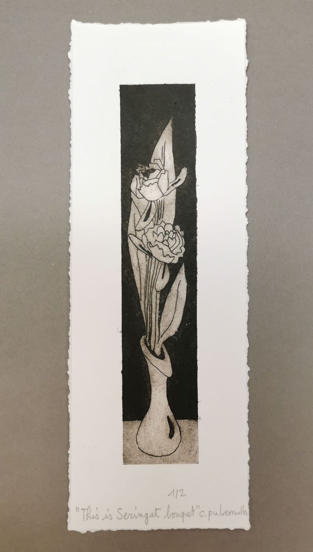 Gravure 1/2 (premier tirage sur deux tirages numérotés). 8,6cm x 24,8. À encadrer. Création originale Catherine Pulvermuller.